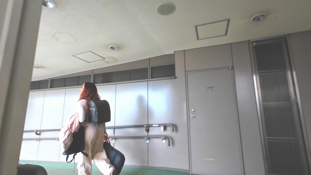 搭乗時、前のお姉さんが背負っているのはなんとランドセル!