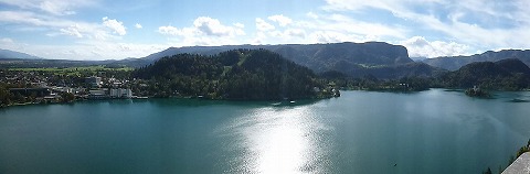 上から見たブレッド湖。浮かぶ小島はスロベニア唯一らしいです。小島には教会が建っています。