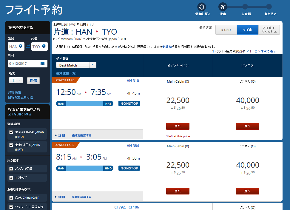 ハノイ→東京で検索。デルタ航空以外の航空券も検索できます。