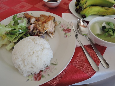 昼食でした。チキンと野菜炒めにご飯とスープとバナナでした。見た目よりもかなり美味しかったです。