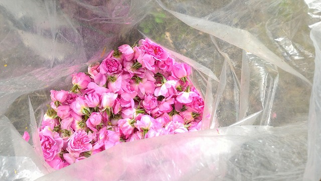 袋の中にはバラがたくさん。これが、ローズオイルを抽出するダマスクローズです。